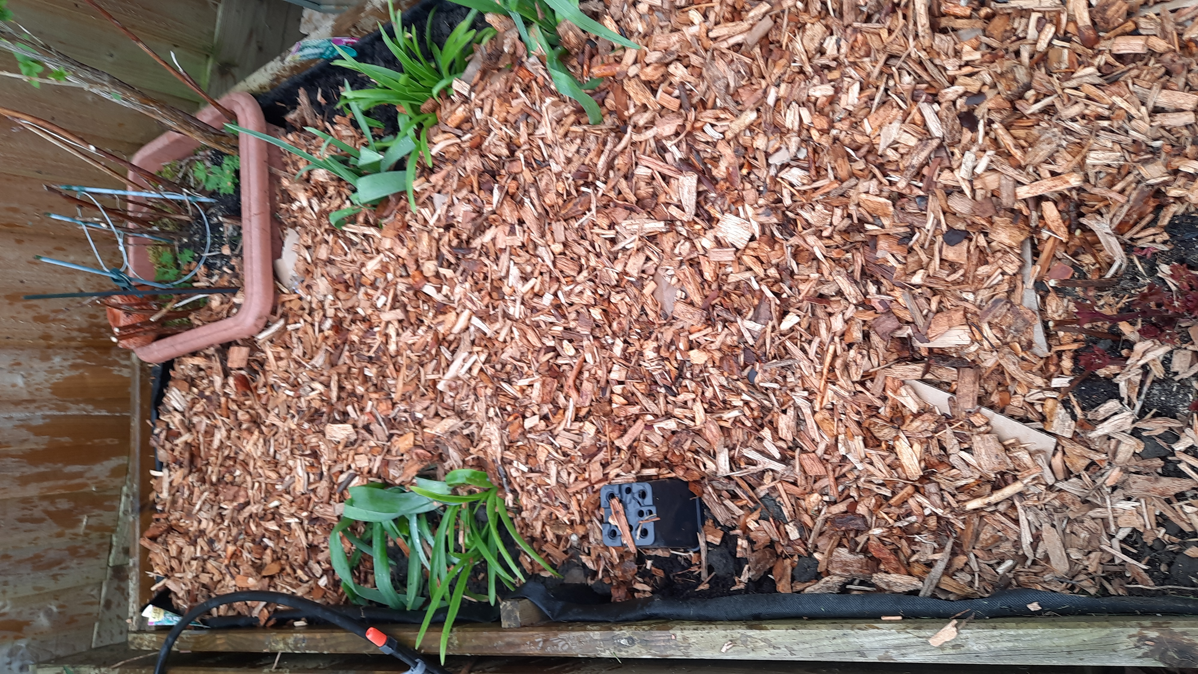 Freshly laid wood chip bed. An extra layer of chips was added to cover the cardboard for neatness.